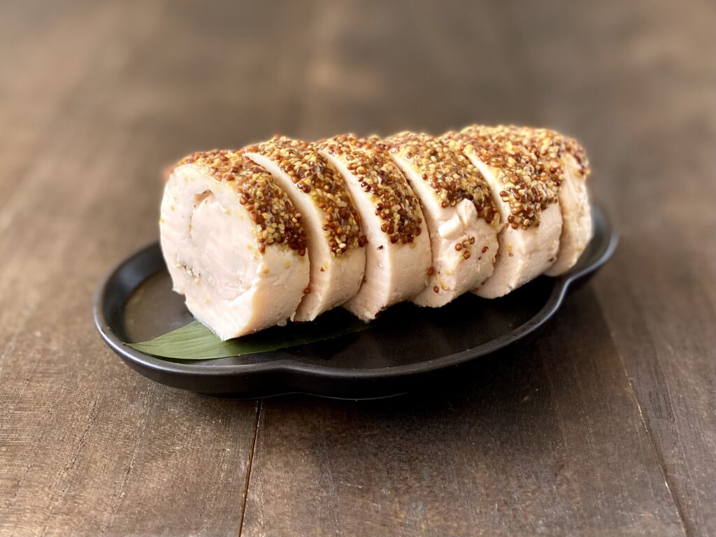 定番の鶏ハムにマスタードソースを付けて華やかな仕上がりにして行きます