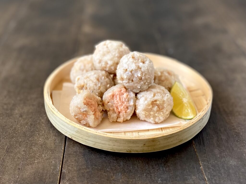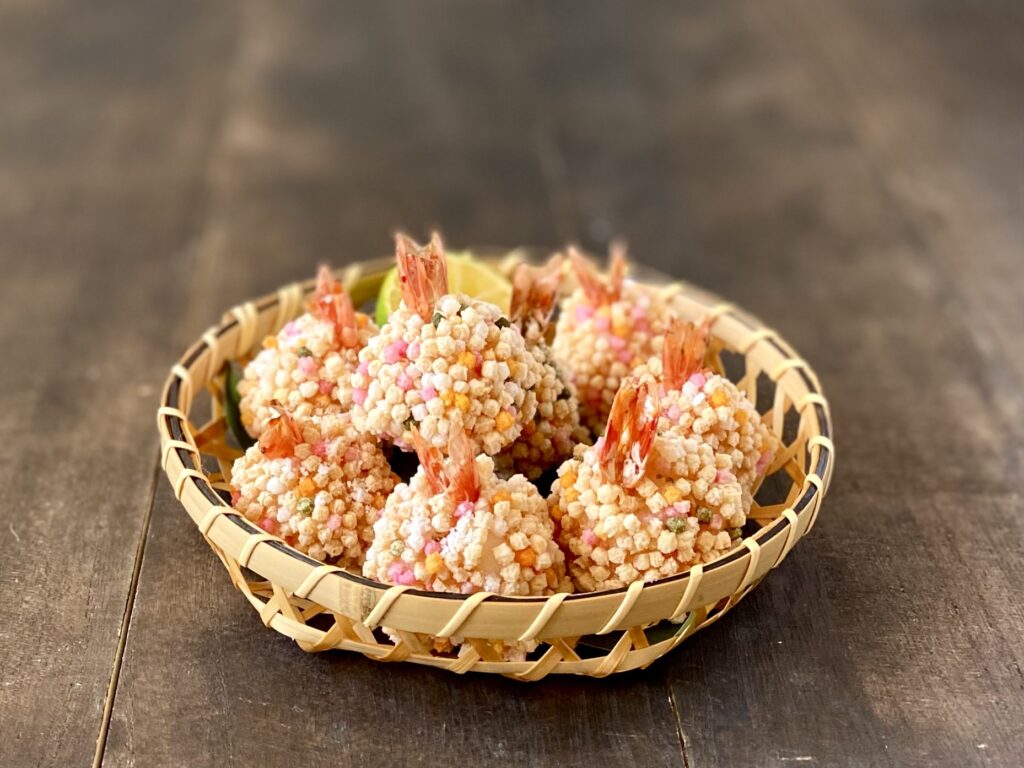 海老のすり身をぶぶあられで覆って可愛らしい揚げ物に仕上げます