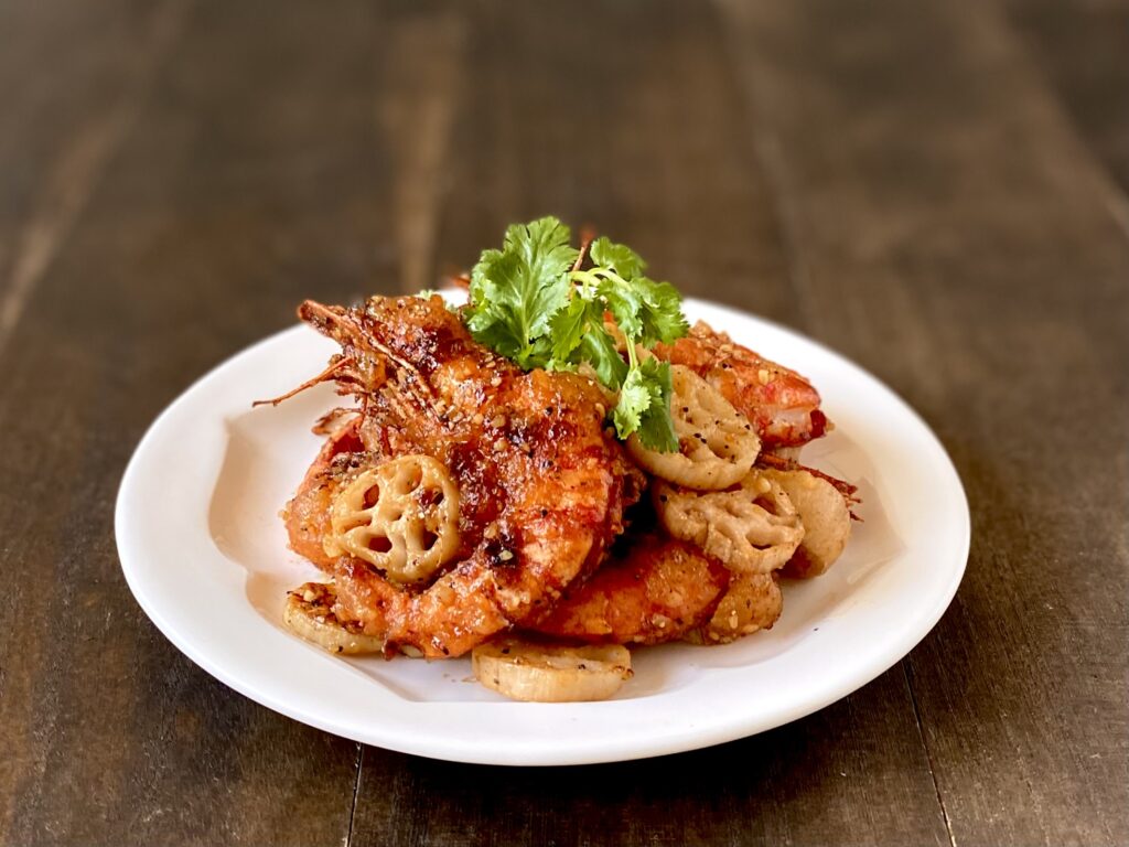 スパイス糀で下味をつけた海老と旬の蓮根をスパイス糀ベースの調味料でソテーしたやみつきになる一品。海老は、タンパク質、疲労回復、生活習慣病予防(コレステロール低下、動脈硬化予防)、冷え性改善、美容効果(美肌、老化防止)、免疫力アップなどに効果が期待できます。特に、身だけでなく殻にも栄養(キチン、アスタキサンチン)が豊富で、体を温める効果も期待できるため、今回は殻付きで調理していきます。