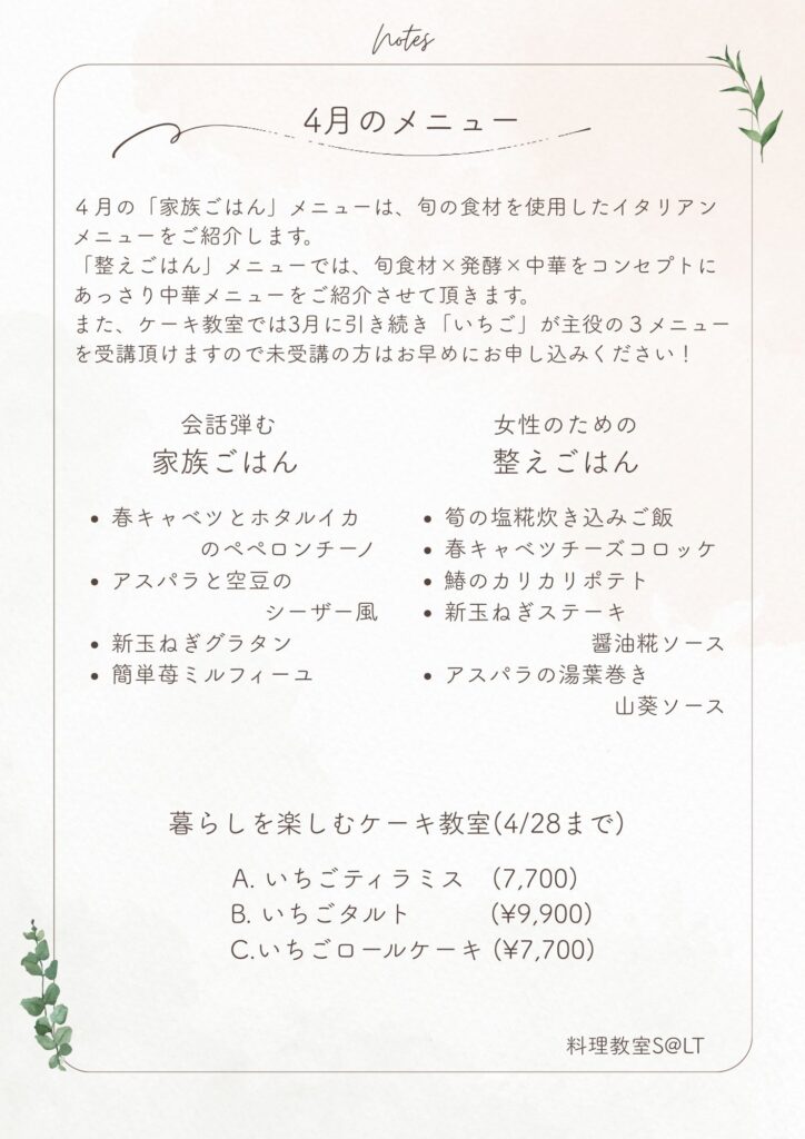 2026年4月メニュー(再UP)のご案内 Written by cookingstudiosalt on 2026年3月4日 in S@LT BLOG 料理教室S@LTです。 2026年4月メニューをご紹介させて頂きます。 天候や仕入れ状況でやむを得ずメニュー変更する事もございますのでご了承くださいませ。 最終決定しましたら後日ブログにてご案内させて頂きますのでよろしくお願いいたします。 アトリエS@LTについての詳細はこちらからご覧ください