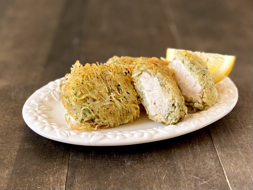 鰆に細切りポテトを衣にまとわせ、カリッと揚げ焼きしました。お魚嫌いな方にも喜んで頂ける一皿です。