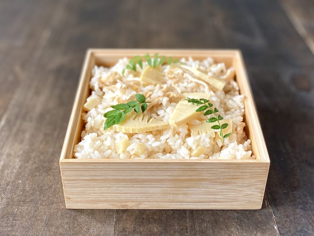 出汁香る筍ごはん。調味料に塩糀を加えたことで優しい塩加減の炊き込みご飯になりました。
