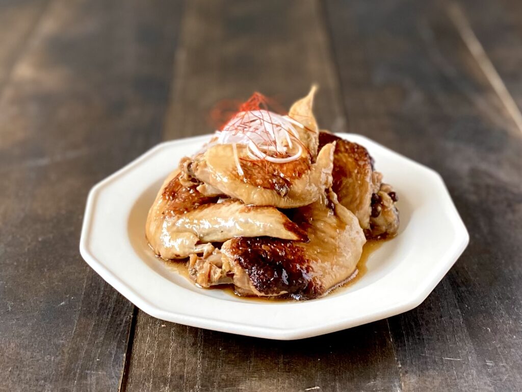 一度柔らかく煮込んだ鶏手羽先をスパイス醤油をベースにしたタレに漬け込んで仕上げていきます。あっさりとした味わいで、おつまみにも最適です